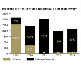Starting in 2020, the University of Colorado Health system (UCHealth), the state's largest nonprofit hospital system, began relying heavily on third-party debt collectors to engineer lawsuits against its own patients. Though UCHealth had consistently brought lawsuits against patients through 2019, UCHealth sharply decreased its own debt collection actions against its patients the following year. At the same time, total debt collection actions brought by CollectionCenter Inc (CCI), a collection agency owned by a revenue cycle management company, more than doubled. A sample of court records indicates that the majority of CCI's actions were brought on behalf of UCHealth.