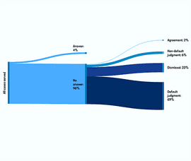 The Oregon Judicial Branch shared court docket data with January Advisors to analyze the scope of consumer debt lawsuits in the state. The analysis found the civil docket is dominated by specialized, high-volume filers suing individuals for credit card and medical debt. Only 4% of Oregonians who are sued participate in the case against them. As a result, most lawsuits end in default judgment, an automatic win for the plaintiff, which can have spiraling negative consequences for the person sued.