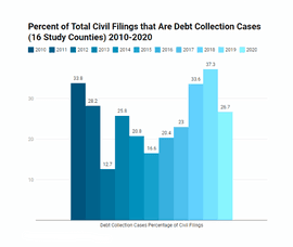 The Virginia Poverty Law Center, with assistance from The Pew Charitable Trusts, accessed bulk general district court data to analyze consumer debt cases by identifying top filers, case outcomes, and post-judgment enforcement practices. The analyses show how the volume of debt collection lawsuits filed and subsequent post-judgment collection activity through the courts can devastate the household finances, including a disproportionate share of people in Black and Latino communities.